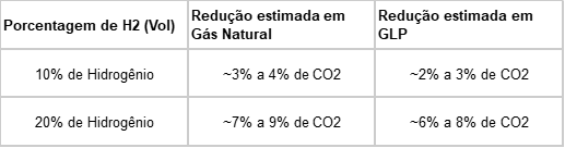 A redução de emissões de Escopo 1 varia conforme a proporção de hidrogênio verde injetada na mistura. Abaixo, apresentamos a estimativa de redução direta para os dois combustíveis base: